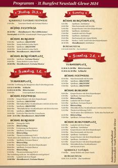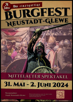 Die Stadt Neustadt-Glewe lädt auch in diesem Jahr wieder zu einer spektakulären Zeytreise ins Mittelalter ein. Nicht nur die Burg bietet eine wunderschöne Kulisse für solch eine Veranstaltung, auch das hochwertige Programm auf 3 Bühnen, darstellendes Handwerk, Kinder-Mitmachangebote sowie die einzigartigen Huscarl-Schlachten, welche die größten ihrer Art in Europa sind, sind jedes Mal ein Publikumsmagnet. Wir freuen uns auf ein schönes Burgfest mit vielen kleinen und großen Besuchern.