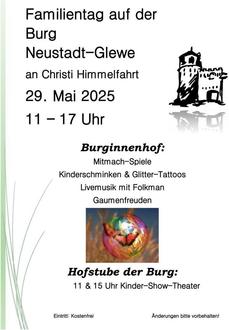 Die Stadt Neustadt-Glewe lädt am Feiertag zu Christi Himmelfahrt, 29. Mai 2025, zum „Familientag“ auf die Burg ein. Nutzen Sie die Gelegenheit und kommen Sie mit dem Fahrrad auf die Burg, um schöne Stunden mit der Familie zu verbringen. Der Eintritt hierfür ist frei. Der Parkplatz an der Burg und auch die Straße „Alte Burg“ ist an dem Tag wegen dem Aufbau zum Burgfest gesperrt.