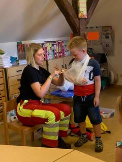 Um gut gerüstet in die Ferien zu starten, fand ein Erste-Hilfe-Kurs am Kind und fürs Kind statt. Tolles Projekt!