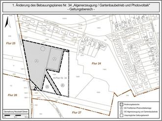 Die Stadtvertretung der Stadt Neustadt-Glewe hat in Ihrer Sitzung am 23.05.2024 den Vorentwurf zur 1. Änderung des Bebauungsplanes Nr. 34 der Stadt Neustadt-Glewe „Algenerzeugung / Gartenbaubetrieb und Photovoltaik“ an der Laascher Straße (Nachnutzung ehemaliger Gärtnerei), bestehend aus der Planzeichnung (Teil A) und den textlichen Festsetzungen im Text (Teil B) sowie den örtlichen Bauvorschriften beschlossen und zur öffentlichen Auslegung gemäß § 3 Abs. 1 BauGB bestimmt.