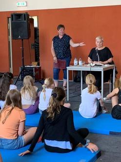 Gespannt nahmen die Viertklässler nach der Hofpause in der Turnhalle Platz. Dort erwartete sie neben Frau Balzer zu ihrer Überraschung noch eine Dame. Es war die Kinderbuchautorin Tamara Bach. Sie stellte ihr Buch „Das Pferd ist Ein Hund“ vor. Dieses liebevoll, witzig und interessant geschriebene Buch für Kinder ab 10 erzählt warmherzig von Familie, Freundschaft und dem Alltag in einer etwas ungewöhnlichen Situation. Eine der wichtigsten Figuren dieses Buches ist ein unsichtbarer Hund mit Namen „Das Pferd“. Natürlich wurde nicht zu viel verraten. Schließlich sollten die Kinder durch diese Buchvorstellung neugierig gemacht und zum Lesen animiert werden. Das ist sehr gut gelungen. Angeregt diskutierten die Kinder im Anschluss über den Inhalt des Buches und stellten, speziell über den Hund „Das Pferd“ viele Mutmaßungen an. Nun, um sich Fragen wie: Welche Rasse? Welche Größe? Welche Farbe? und so weiter, dieser Hund mit Namen „Das Pferd“ wohl hat beantworten zu können, dazu werden sie das Buch schon selber lesen müssen.
