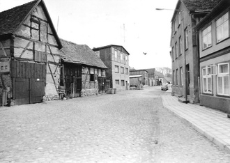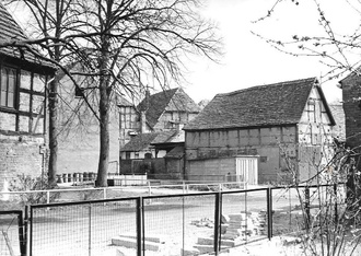 Ein Blick in die Burgstraße im Jahr 1976, beginnend bei der Kirche auf die Hofbebauung der Breitscheidstr. 20 und 18.