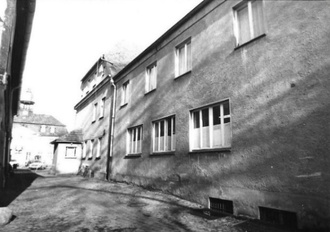 Die Schuppen / Scheunen der Grundstücke Breitscheidstr. 18 und 16. Heute befinden sich dort Hof- / Parkflächen. Daneben die damalige Werkstatt zur Reparatur von Rundfunk und Fernsehgeräten, später Bibliothek mit der Anschrift Burgstr. 19.