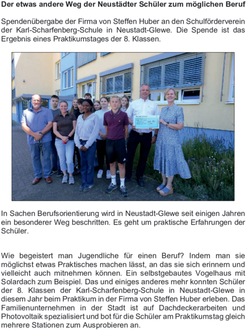 Spendenübergabe der Firma von Steffen Huber an den Schulförderverein der Karl-Scharfenberg-Schule in Neustadt-Glewe. Die Spende ist das Ergebnis eines Praktikumstages der 8. Klassen.