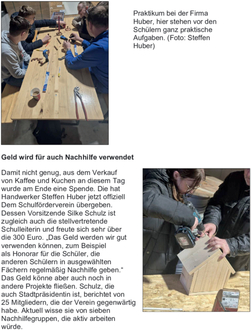 Damit nicht genug, aus dem Verkauf von Kaffee und Kuchen an diesem Tag wurde am Ende eine Spende. Die hat Handwerker Steffen Huber jetzt offiziell Dem Schulförderverein übergeben. Dessen Vorsitzende Silke Schulz ist zugleich auch die stellvertretende Schulleiterin und freute sich sehr über die 300 Euro. „Das Geld werden wir gut verwenden können, zum Beispiel als Honorar für die Schüler, die anderen Schülern in ausgewählten Fächern regelmäßig Nachhilfe geben.“ Das Geld könne aber auch noch in andere Projekte fließen. Schulz, die auch Stadtpräsidentin ist, berichtet von 25 Mitgliedern, die der Verein gegenwärtig habe. Aktuell wisse sie von sieben Nachhilfegruppen, die aktiv arbeiten würde.