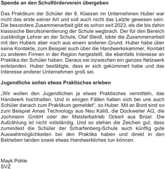 Das Praktikum der Schüler der 8. Klassen im Unternehmen Huber war nicht das erste seiner Art und soll auch nicht das Letzte gewesen sein. Die besondere Zusammenarbeit gibt es schon seit 2023, als die bis dahin klassische Berufsorientierung der Schule wegbrach. Der für den Bereich zuständige Lehrer an der Schule, Olaf Steidl, lobte die Zusammenarbeit mit den Hubers aber noch aus einem anderen Grund. Huber habe über seine Kontakte, zum Beispiel auch über die Handwerkskammer, Kontakt zu anderen Firmen in der Region hergestellt, die ebenfalls Interesse an Praktika der Schüler haben. Daraus sei inzwischen ein ganzes Netzwerk entstanden. Huber bestätigte, dass er sich gekümmert habe und das Interesse anderer Unternehmen groß sei. Jugendliche sollen etwas Praktisches erleben