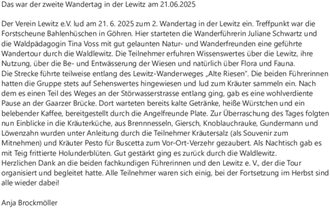 Herzlichen Dank an die beiden fachkundigen Führerinnen und den Lewitz e. V., der die Tour organisiert und begleitet hatte. Alle Teilnehmer waren sich einig, bei der Fortsetzung im Herbst sind alle wieder dabei!
