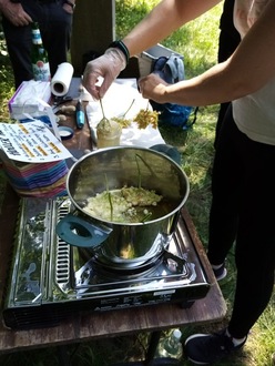 Hier starteten die Wanderführerin Juliane Schwartz und die Waldpädagogin Tina Voss mit gut gelaunten Natur- und Wanderfreunden eine geführte Wandertour durch die Waldlewitz. Die Teilnehmer erfuhren Wissenswertes über die Lewitz, ihre Nutzung, über die Be- und Entwässerung der Wiesen und natürlich über Flora und Fauna. Die Strecke führte teilweise entlang des Lewitz-Wanderweges „Alte Riesen“. Die beiden Führerinnen hatten die Gruppe stets auf Sehenswertes hingewiesen und lud zum Kräuter sammeln ein. Nach dem es einen Teil des Weges an der Störwasserstrasse entlang ging, gab es eine wohlverdiente Pause an der Gaarzer Brücke. Dort warteten bereits kalte Getränke, heiße Würstchen und ein belebender Kaffee, bereitgestellt durch die Angelfreunde Plate. Zur Überraschung des Tages folgten nun Einblicke in die Kräuterküche, aus Brennnesseln, Giersch, Knoblauchrauke, Gundermann und Löwenzahn wurden unter Anleitung durch die Teilnehmer Kräutersalz (als Souvenir zum Mitnehmen) und Kräuter Pesto für Buscetta zum Vor-Ort-Verzehr gezaubert. Als Nachtisch gab es mit Teig frittierte Holunderblüten.