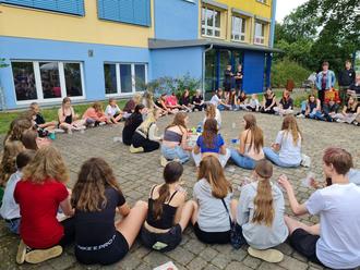 Zum Abschluss und aus guter Tradition kamen dann viele Schüler*innen zum diesjährigen Becherrap, mit und ohne Becherweitergabe, zusammen.