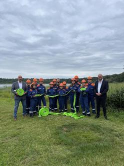 Bürgermeister Steffen Klieme (l.i.B.) und Maik Rudolph (r.i.B.) von der WOBAU Neustadt-Glewe bei der Übergabe an die Jugendfeuerwehr