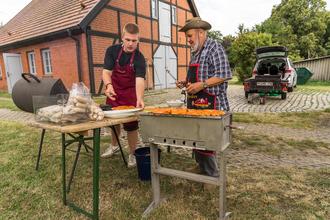Gegen 18 Uhr wechselte der Nachmittag in einen kulinarischen Teil. Der Grill wurde angeheizt, und der Duft von Bratwürsten und Steaks mischte sich mit dem Klang der Gespräche. Ergänzt wurde das Angebot durch eine bunte Auswahl an selbst zubereiteten Salaten, die von den Frauen der Gruppe mitgebracht worden waren.