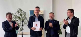 Preisträger Jörn van Hall (2.v.li.), rechts im Bild Bürgermeister Andreas Grund.
