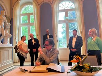Vorne unterzeichnet Hannu Raudaskoski aus Rovaniemi im goldenen Buch der Residenzstadt. Hinten: (v.r.n.l.) Kunnan Pojak Band-Kollegin Annu Nietula, Bürgermeister von Neustrelitz Andreas Grund, Bürgermeister von Schwäbisch-Hall Daniel Bullinger, Bürgermeister aus der Stadt Szcecinek und seine Kollegin und Übersetzerin Malgorzata Kuszmar.