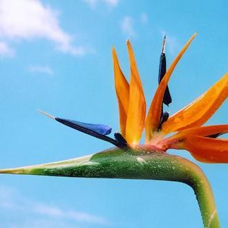 Die Strelitzia reginae, Strelitzie der Königin, gelangte 1776 durch Pflanzenjäger in die Königlichen Gärten von Kew bei London, wo sie erstmals botanisch beschrieben wurde. Queen Charlotte verschenkte 1818 eine Staude an den Hof in Neustrelitz, wo ihr Neffe Georg Großherzog war. Die Staude blühte 1822 als erste Strelitzie in Deutschland in der herzoglichen Orangerie am hiesigen Schlossgarten.