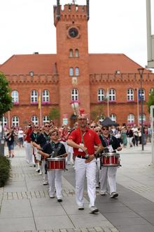 Der Neustrelitzer Fanfarenzug vor dem Rathaus in Szczecinek