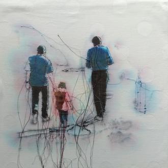 In ihren textilen Kunstwerken verwebt die Berliner Künstlerin Rita Zepf Stoff, Faden und Erinnerung. Ihre Bilder konzentrieren sich auf das Zwischenmenschliche. Der Raum um die Figuren bleibt blass – wie unsere Erinnerungen. Nur feine Fadenlinien deuten ihn an. Die Menschen aber, die Kinder und Erwachsenen, leuchten auf. Stoff bringt ihnen Farbe und Form. Volumen entsteht durch abgestepptes Material, durch Ausbleichungen, das wie Sonnenlicht – scheinbar zufällig – sich auf ihre Körper legt. Die Fäden, mit denen Zepf näht, hängen oft lose herab. Sie verbinden sich mit anderen. Sie sind wie unsichtbare Bande – Erinnerungen an gemeinsame Zeiten, geteilte Krisen, freudige Momente des kleinen Glücks. Liebe, die durch Stoff tastbar wird. Rita Zepf näht Erinnerungsbilder. Sie nutzt Stoffe, die selbst Geschichte tragen: alte Bettlaken, Tischdecken, Stoffreste. Wir als Betrachtende knüpfen an. Ihre Kunst berührt nicht nur das Auge, sondern auch das Geflecht unserer synaptischen Verbindungen. Plötzlich tauchen eigene Szenen auf – Menschen, Räume, Momente.