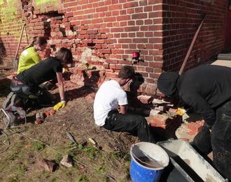 Die Gruppe der Jugendbauhütten der Deutschen Stiftung Denkmalschutz am Werk.