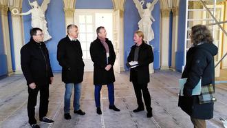 Von links nach rechts: Bürgermeister Andreas Grund, der Landtagsabgeordnete und Stadtvertreter Andreas Butzki und Minister Heiko Geue ließen sich von Thomas Greier, Dezernent im SBL Neubrandenburg, über den Stand der Restaurierung in der Orangerie informieren.
