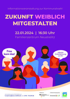 Die Gleichstellungsbeauftragte der Stadt Neustrelitz, Anne-Kathrin Utesch, und die Koordinierungs- und Fachstelle der Partnerschaft für Demokratie, Kristina Ropenus, laden alle Frauen herzlich zu einer Informationsveranstaltung am 22.01.2024 in das Familienzentrum Neustrelitz ein.