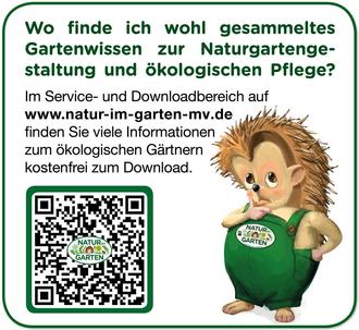 „Natur im Garten MV“ Regional bietet Interessierten die Möglichkeit, die Themenwelt des ökologischen Gärtnerns auf ihren Veranstaltungen zu präsentieren. Regionalkoordinatorin Madlen Kuhn-Hagemann unterstützt vor Ort mit einem Infostand und einer Saatguttauschbörse - von grünem Frühlings- und Herbstmarkt bis Erntedankfest oder Tag der offenen Tür. Ob auf Marktplätzen, in Schulen, Kitas oder Gemeindehäusern: Der Infostand informiert Besucher mit kostenfreien Materialien und Fachberatung zur naturnahen Gartenpflege. Die Saatguttauschbörse bietet samenfestes Saatgut von Tomaten bis Wildstauden, das Interessierte tauschen können. Kontakt: Madlen Kuhn-Hagemann, Telefon: 0176-60399536.