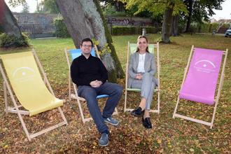 Künftig sorgen von der Sparkasse Mecklenburg-Strelitz geförderte Liegestühle für eine chillige Atmosphäre bei den Konzerten der Musikschule Kon.Centus. Susanne Schön, Vorsitzende des Vorstandes der Sparkasse Mecklenburg-Strelitz und David Kantel, der stellvertretende Schulleiter, testeten die bunten Exemplare schon einmal vorab und waren zufrieden.