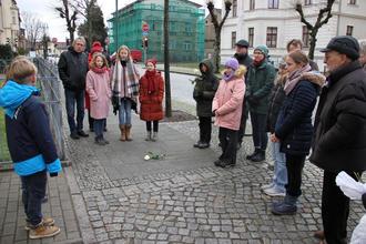 Wie es jüdischen Familien in Neustrelitz während der Zeit der Barbarei und Unterdrückung durch die Nationalsozialisten erging, stand im Mittelpunkt eines kleinen Rundganges, auf den sich die Schülerinnen und Schüler schon im Unterricht sehr gut vorbereitet hatten. Dr. Ernst Dörffel, Initiator der Neustrelitzer Initiative „Sie waren unsere Nachbarn“, führte zu den Stolpersteinen vor den früheren Wohnhäusern jüdischer Einwohner in der Augustastraße 27 und am Töpferberg 4. „Die Stolpersteine liegen hier, damit wird mit unseren Gedanken `stolpern` und uns immer an das Schicksal der Menschen, die hier gelebt haben, erinnern“, erläuterte er im Gespräch mit den Kindern. Die Mädchen und Jungen trugen Gedichte und Texte vor. Zum Gedenken an die vertriebenen, deportierten und getöteten jüdischen Familien legten sie weiße Rosen auf die Stolpersteine.