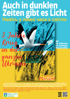 Im Rathaus von Neustrelitz wird ab dem 24. Februar 2025 die Ausstellung „Auch in dunklen Zeiten gibt es Licht“ gezeigt, die den seit drei Jahren andauernden Krieg in der Ukraine thematisiert. Mit 25 eindrucksvollen Werken ukrainischer Illustratorinnen und Illustratoren erzählt die Ausstellung von der Widerstandskraft, dem Mut und der Hoffnung der Menschen in der Ukraine. Die Bilder dokumentieren den Alltag unter Kriegsbedingungen, die Hilfe von Freiwilligen für die Verwundbarsten sowie den unerschütterlichen Glauben an Freiheit und Gerechtigkeit.