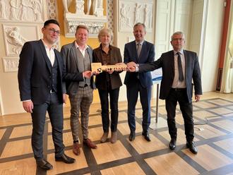 Symbolische Schlüsselübergabe, v.l.n.r. Kai Stegemann und Michael Piletzki als Pächter von der MiKa Gastro UG, Objektmanagerin Angela Worgull des SBL NB, Finanzminister Dr. Heiko Geue und Winfried Tasler, Leiter des SBL NB im Gelben Saal.
