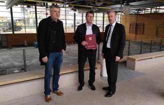 Bauminister Pegel, Bürgermeister Andreas Grund und das Mitglied des Landtages MV Andreas Butzki bei der Übergabe des Förderbescheides in der Strelitzhalle (v.r. n.l.).