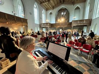 Besucher begutachten die Werke von Richard Hess während Friederiche Holdefleiß am Klavier spielt.