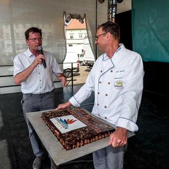 Der Strelitzienkuchen von Bäcker Reinhold wurde zusammen mit dem Bürgermeister Andreas Grund angeschnitten.