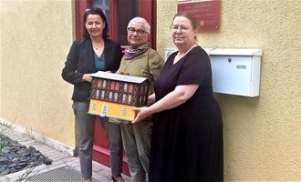 Andrea Binkowski, Hannelore Raemisch und Martina Kaiser (v.l.) tragen „ihr Haus“ auf Händen.