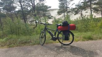 ... Auf der Fähre hatte ich ein kurzes Gespräch mit einem jungen Litauer, der mir auch gleich Tipps für die Radwege gab. Der gesamte Radweg war über die 55 km bis Nida zwar durchgehend gut beschildert, an manchen Stellen war die ursprünglich vorhandene dünne Asphaltdecke aber völlig verwittert. Es war über große Abschnitte eine ziemlich holprige Fahrt mit teils sehr engen Kurven. Höchste Aufmerksamkeit war gefragt. Ich begegnete einzelnen Radlern und zweimal geführten Radgruppen. Im ersten Drittel fuhr ich kurz neben der zur Ostsee zugeneigten Düne durch junge Landschaft.