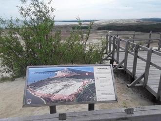 Der von mir gesuchte Campingplatz liegt etwa 2 km hinter dem Ortszentrum von Nida. Trotz mehrfach eingeholten Wegehinweisen konnte ich Fehlversuche nicht vermeiden. Einer dieser Fehlversuche führte mich sehr steil auf einer Asphaltstraße immerhin auf über 50 m Höhe an den Rand der Wanderdünen. Vom Campingplatz war nichts zu sehen und ich bekam mit, dass die Straße zu einem Parkplatz oberhalb von Nida führte. Ich genoss natürlich erst den wundervollen Ausblick auf die Nehrung bis hinüber zum russischen Teil. Dieser Ausblick war auf jeden Fall jede Mühe wert, auch wenn ich danach den Hügel wieder hinunterfahren musste.