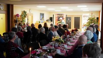 Festlich geschmückt war die Tafel zur Kaffeezeit für die Gäste und natürlich hat der Nikolaus auch für sie eine kleine Aufmerksamkeit am Platz hinterlassen. Bei Kaffee und selbstgebackenem Kuchen genossen sie das Beieinandersein, die entspannten Gespräche und die weihnachtliche Stimmung. Das Highlight aber war die Show von Klaus Reiners, alias „Bauer Hellwig“. Der Kabarettist und Conférencier aus Schwerin blickte aus der Landmann-Perspektive humorvoll auf Alltag, Politik und Gemeindeleben. Mit seinen lustigen Gags und Liedern sorgte er für Ausgelassenheit und herzliches Lachen. „Lachen ist ja auch noch steuerfrei!“, so seine Devise.