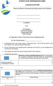 Für Ihr Mitmachen danken wir im Voraus. Schicken Sie uns dazu nur die Vereinbarung mit Ihren Angaben per Email an: info@amt-niepars.de oder per Post: Amt Niepars, Laufteam, Gartenstr. 69b, 18442 Niepars zurück.