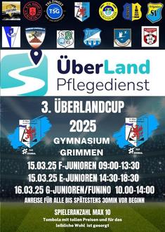 Am 15. Und 16.03.2025 findet das Hallenturnier für G-, F- und E-Jugend ab 09:30 Uhr statt. ÜberLand Pflege wird wieder als Veranstalter fungieren und unterstützt uns bei der Durchführung des Turnieres.