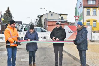 Planer Heiko Rohatzsch (IB Brückenköpfe GmbH), Sabine Dittmer aus dem Bauamt, Bürgermeister Dirk Flörke und Björn Bick von der bauausführenden Firma (Matthäi Bauunternehmen GmbH & Co. KG) durchtrennen das symbolische Band.