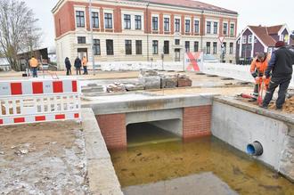 Das Gros der Arbeiten war geschafft, als sich Vertreter der Stadtverwaltung und der beteiligten Bau- und Planungsfirmen sowie Bürgermeister Dirk Flörke auf der Baustelle einfanden, um das symbolische Band zu durchtrennen. Nach dem Abriss der Verkehrsinsel und des alten Bauwerkskörpers erfolgte die Errichtung des neuen Brückenbauwerkes aus Betonfertigteilen, einschließlich angrenzendem Straßen- und Wegebau. Dazu kamen Leitungsumverlegungen bzw. Neuverlegungen, welche durch die Stadtwerke und den Abwasserentsorgungsbetrieb der Stadt Parchim vorgenommen wurden. Die bereits zuvor an dieser Stelle vorhandene Verkehrsinsel wurde zum Abschluss der Arbeiten in der vorherigen Art und Weise wiederhergestellt und der Straßenbelag erhielt über dem Brückenbauwerk die typische Wellenform. Die Straßenlampe bekam einen neuen Aufsatz mit energiesparender LED-Technik.