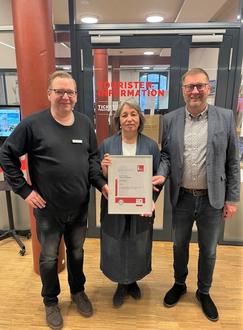 Bärbel Sawatzki und Steffen Struck von der Touristinformation Parchim und Bürgermeister Dirk Flörke präsentieren das erneuerte Zertifikat.