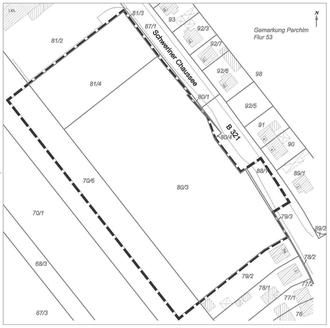 Der räumliche Geltungsbereich des Bebauungsplanes umfasst eine Fläche von ca. 1,72 ha und beläuft sich auf die Flurstücke 80/3, 81/4 und Teilstücke der Flurstücke 70/6, 79/3, 88/1 der Flur 53 in der Gemarkung Parchim.