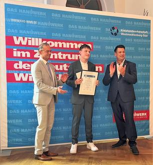 Ehrung Jahrgangsbester Geselle v.l. Präsident der Handwerkskammer Schwerin Uwe Lange, Bäcker Leonard Mootz und Kreishandwerksmeister Reiko Ehbrecht