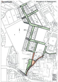 Die Verkehrsflächen Verlängerung Plümperwiesenweg, Verlängerung Gneisenaustraße, Planstraßen A – F, der Verbindungsweg Südring/Buswendeschleife und der Verbindungsweg Putlitzer Straße/ Verlängerung Gneisenaustraße sind im Übersichtsplan grün gepunktet dargestellt.