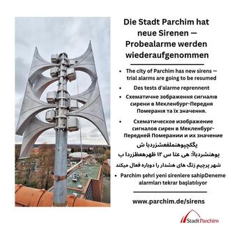 Im Vorfeld des erstmaligen Probealarms führt die Stadt Parchim derzeit eine verstärkte Informationskampagne durch. Hierzu sind in den städtischen Schulen, Übersetzungen der Hinweise auf die Alarme verteilt worden um eine möglichst große Verbreitung zu erreichen und etwaige Unruhe zu vermeiden. Unter anderem wird neben dem Deutschen, in Englisch, Französisch, Russisch, Ukrainisch, Türkisch, Dari, Persisch und Arabisch über die Bedeutung der wöchentlichen Sirenenalarme aufgeklärt. Zusätzlich wird in Sozialen Netzwerken und auf der Homepage der Stadt Parchim in den verschiedenen Sprachen informiert.