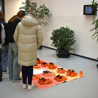 Schülerinnen und Schüler betrachten die in einem Schul-Projekt gestalteten orangen Schuhe in der Goethe-Regionalschule.