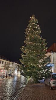 Parchim. Für den Garten zu groß, für den Schuhmarkt genau richtig! Der knapp 30 Jahre alte Nadelbaum aus dem Parchimer Brunnenfeld schmückt seit 18. November unsere Innenstadt. Nachdem er per Schwertransport und Kran auf den Schuhmarkt gebracht wurde, strahlt er bis ins neue Jahr vor dem Kaiserlichen Postamt, über die Blutstraße und die Eisbahn.