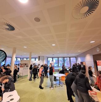 Als spezielles Highlight organisierte eine Arbeitsgruppe bestehend aus der Schulsozialarbeiterin Marie-Sophie Szeszka, der zuständigen AWT-Lehrerin Sarah Kruse und Jana Kallies, Berufsberaterin bei der Agentur für Arbeit, in diesem Jahr eine Azubimesse direkt vor Ort – in den Räumlichkeiten der Schule. Eingebettet in die Projekttage zur Berufsorientierung konnten etwa 25 Austeller für die Messe gewonnen werden. Die Schülerinnen und Schüler konnten am Nachmittag des 31. Januar 2024 mit den unterschiedlichsten Firmen ins Gespräch kommen. So präsentierten sich beispielsweise lokale Handwerksunternehmen neben staatlichen Arbeitgebern und lokale Spediteure neben einem überregionalen Getränkehersteller.