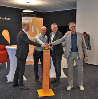 DBL-TSM-Geschäftsführer Knut Wetzig, Parchims Bürgermeister Dirk Flörke und die WEMACOM-Geschäftsführer Volker Buck und Torsten Speth sorgten gemeinsam für das symbolische „Licht an!“ für den Breitbandausbau in Parchims Gewerbegebieten.