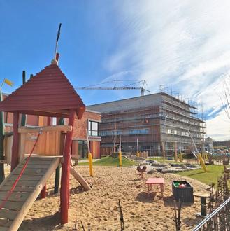 Zusätzlich zum Innenausbau wurde an der Gebäudehülle unlängst mit der Montage der rötlichen Vormauerziegel begonnen. Nach der Fertigstellung werden die Kindertagesstätte des DRK und die Regionalschule ein kohärentes und ansprechendes Ensemble im Umfeld der historischen Bausubstanz bilden. Die bereits eingeweihte DRK-Kita „Forschergeist“ gibt einen guten Ausblick auf das künftige Aussehen des deutlich größeren Schulgebäudes.