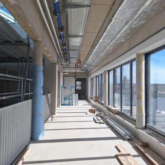 Im Innenausbau laufen gegenwärtig neben Estrich- und Malerarbeiten auch die Heizungs-, Sanitär- und Raumlufttechnikinstallationen. Zusätzlich werden Verkabelungen für die Datennetze und die Gebäudeautomation in dem Gebäude verbaut, Handwerker unterschiedlichster Gewerke finden sich in nahezu jedem Raum.